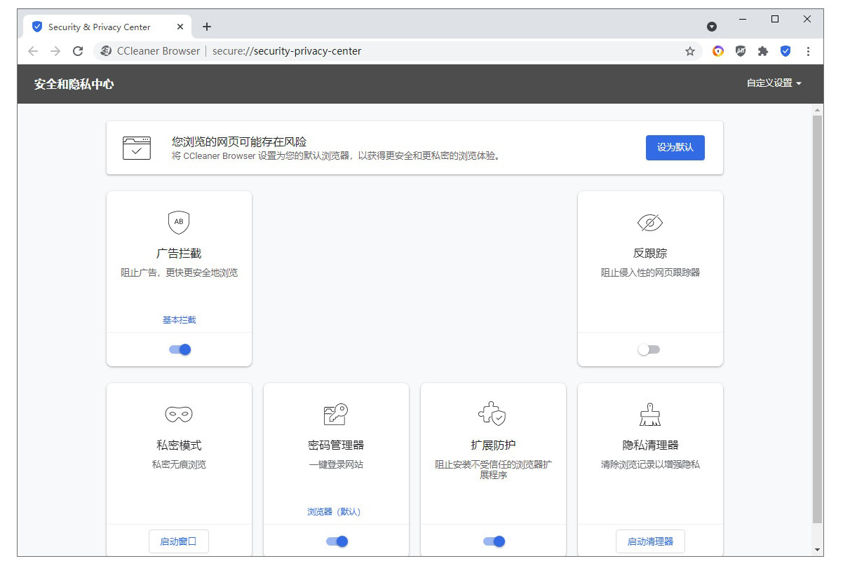 1、CCleaner瀏覽器自帶保護模式,可以避免你受到網絡病毒攻擊,可以避免受到釣魚網站威脅
