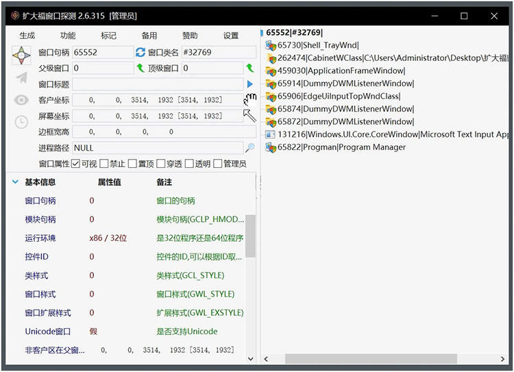 擴(kuò)大福的窗口探測(cè) 是一款網(wǎng)友自制分享的窗口探測(cè)工具,擴(kuò)大福的窗口探測(cè)軟件可以幫助用戶們?nèi)フ{(diào)整窗口的樣式,控件樣式等,讓用戶們可以根據(jù)自己的需求去調(diào)整每個(gè)軟件的窗口。