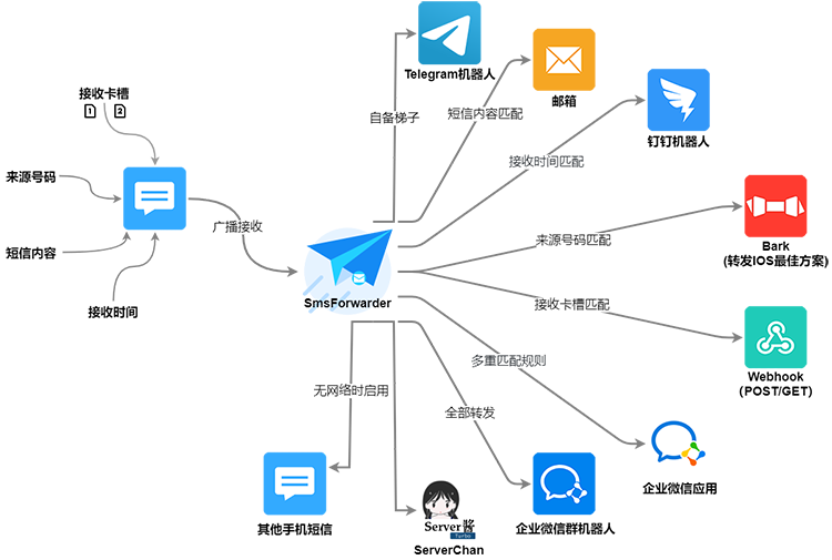 監(jiān)控Android手機(jī)短信并根據(jù)指定規(guī)則轉(zhuǎn)發(fā)到其他手機(jī):釘釘機(jī)器人、企業(yè)微信群機(jī)器人、企業(yè)微信應(yīng)用消息、郵箱、bark、webhook、Telegram機(jī)器人、Server醬、手機(jī)短信等。