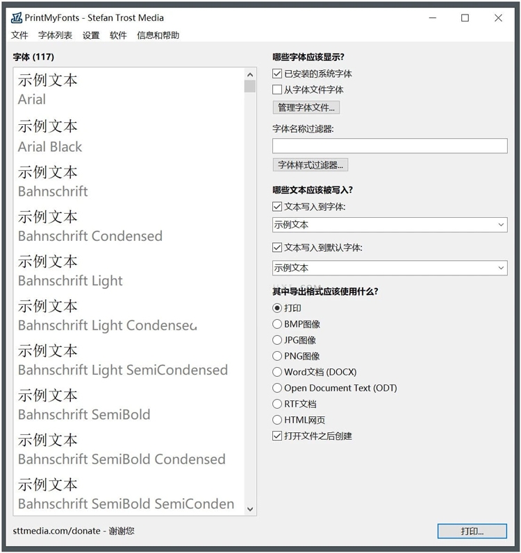 打印和導出:支持將字體列表打印到默認打印機或導出為 PDF、BMP、JPG、PNG、DOCX、ODT、RTF 和 HTML 格式。