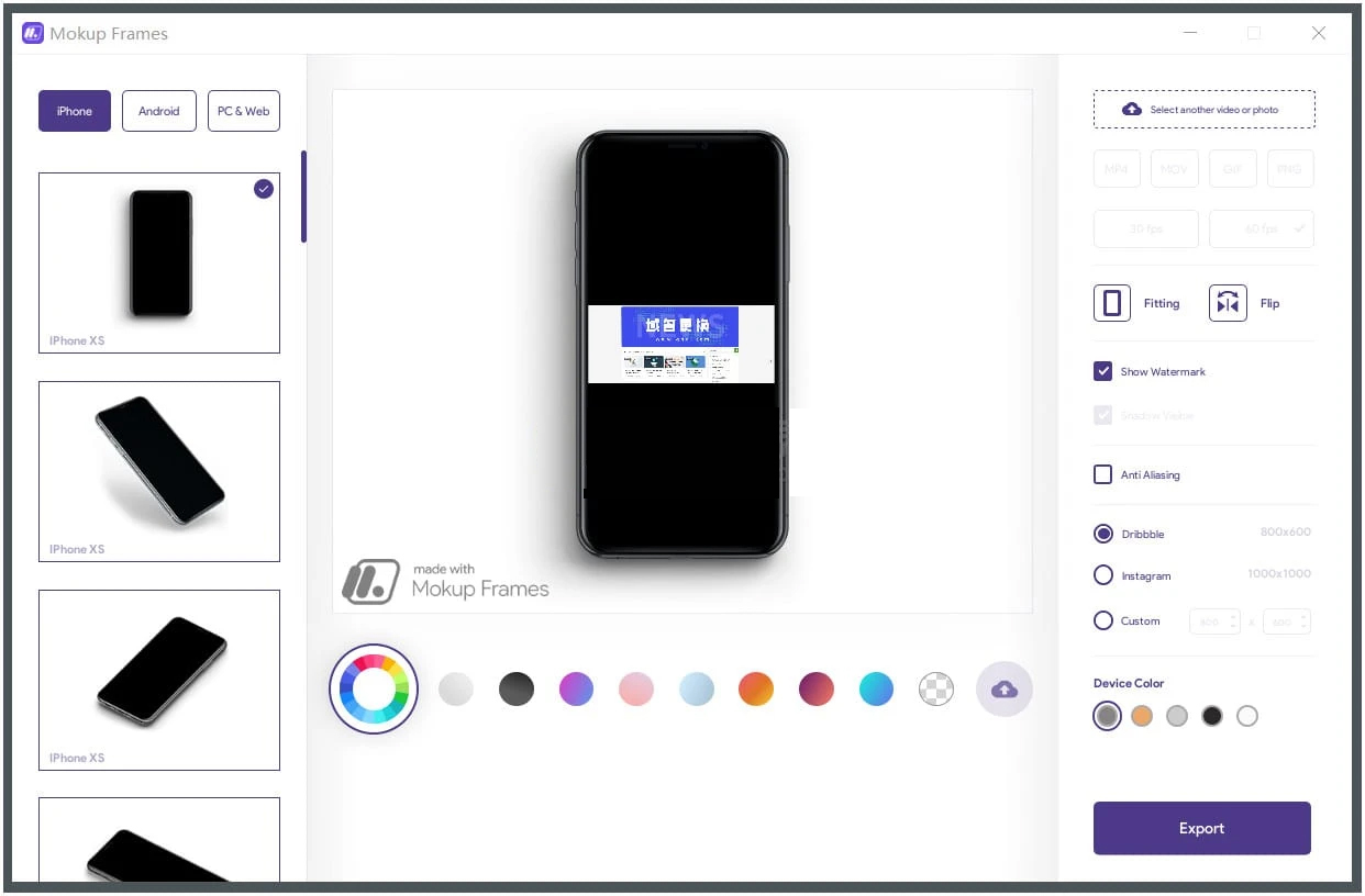 Mokup Frames有102種樣機(jī),涵蓋iPhone,各種安卓手機(jī),以及PC電腦樣機(jī),只需要一鍵上傳,即可任意選擇樣機(jī)類型。完全免費(fèi)的客戶端,支持Win+Mac系統(tǒng),支持上傳圖片,視頻,一鍵生成超酷樣機(jī),模板特別多,質(zhì)量高。并且支持編輯底色,翻轉(zhuǎn),尺寸,支持導(dǎo)出背景透明的PNG圖片,支持導(dǎo)出MP4視頻,超級(jí)強(qiáng)大又方便。