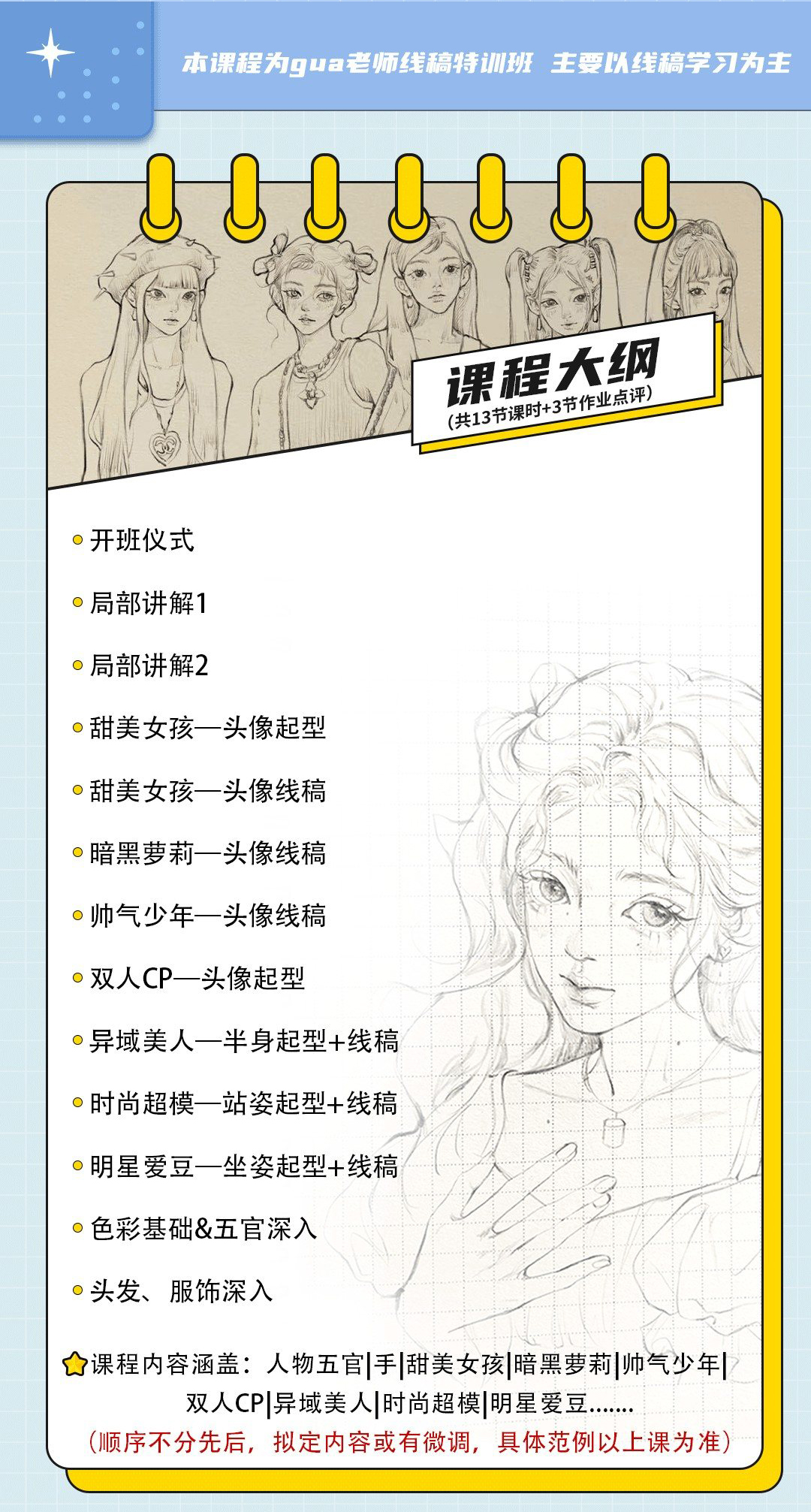 課程會以講解及示范人物線稿為主,從人物五官一步步開始,逐步擴展到人物半身,頭發,服飾以及知識點較難的坐姿,站姿等方面,層層解析到位,帶領大家完成多個完整的線稿實例