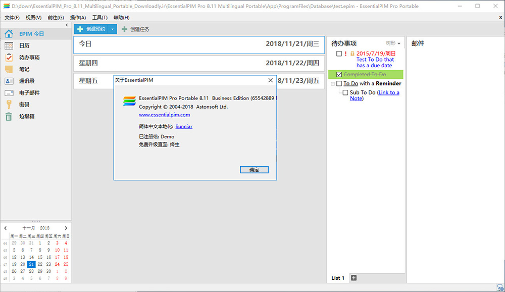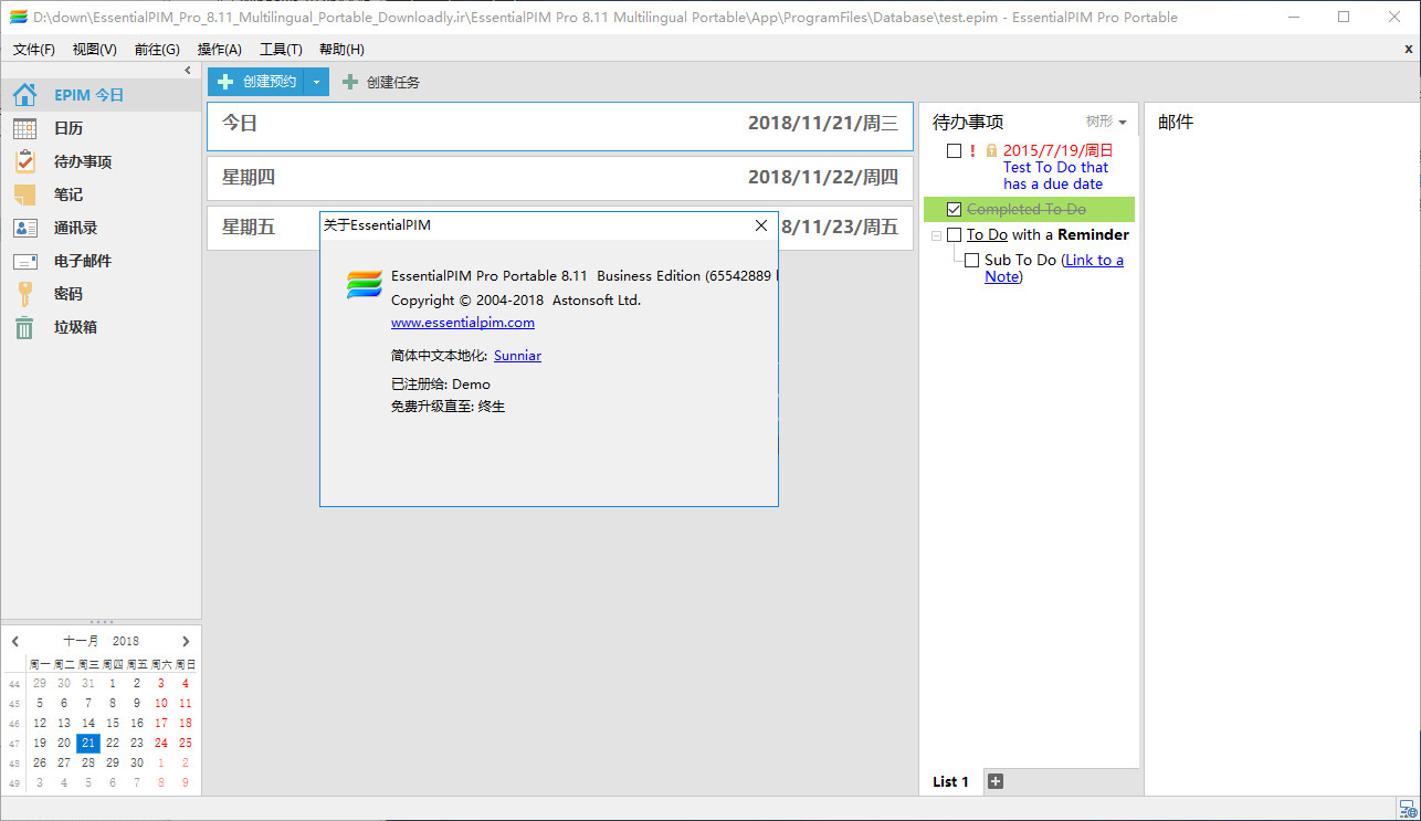 essentialpim pro是款非常杰出的個人信息管理和工作手冊軟件。essentialpim pro能夠很好的幫助用戶管理個人信息,功能功能,簡單易用,能以電子化的形式保存您的信息,您所有的日程、任務、記事、通訊錄、登陸密碼都保存在圖形化界面中且形式簡便。