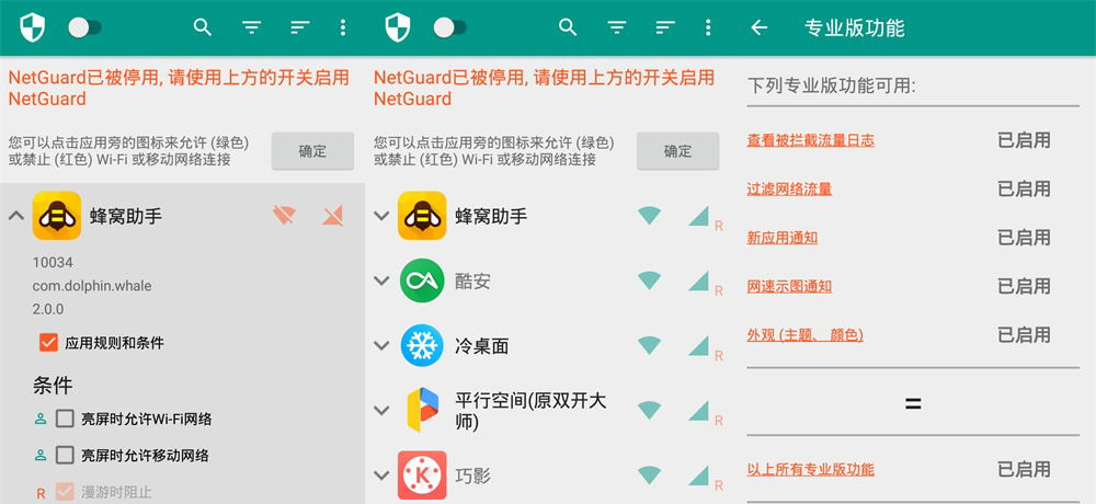 NetGuard使用網絡中間人的技術,限制應用聯網權限,可以給每個應用制定聯網規則,是一款網絡管理必備軟件。其最大的優點就是無需root權限即可自定義你的網絡。阻止應用訪問網絡有利于節省您的數據流量,節電以及保護您的隱私